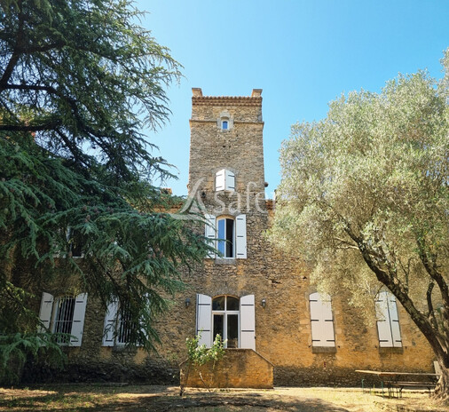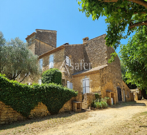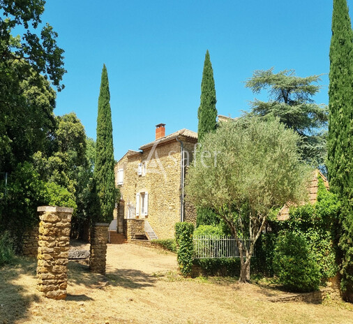 Habitation : Grande maison de maître entièrement bâtie en pierres de pays s'ouvrant sur un jardin arboré clos de murs.