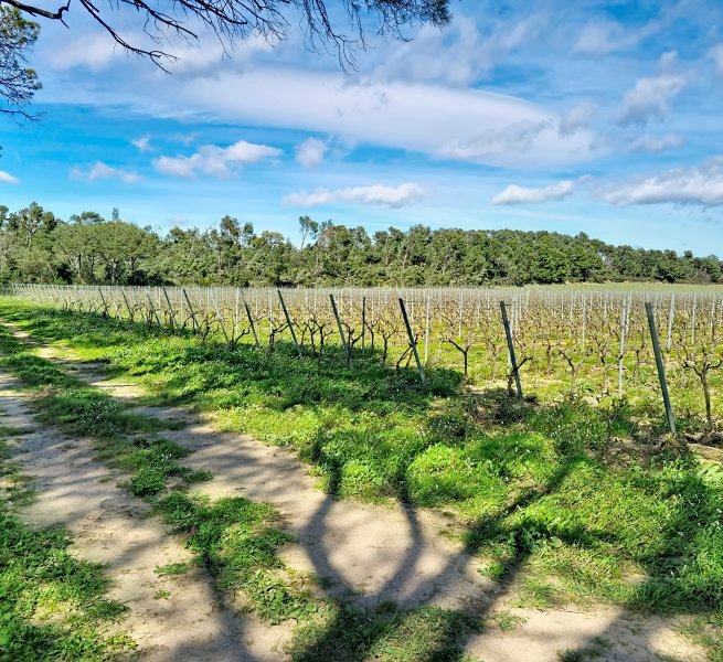 Le vignoble, conduit en agriculture biologique, est majoritairement composé de Chardonnay, planté dans les années 90, avec une conduite qualitative : faible densité, palissage haut et système d’irrigation en goutte-à-goutte. L’ensemble des vignes est entièrement irrigué, alimenté par un forage privé ainsi que par le réseau de l’ASA locale.