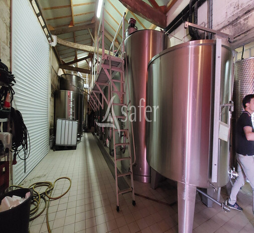 Exploitation :Dans la continuité de la longère, on trouve des bâtiments d'exploitation aux beaux volumes d'une surface exceptionnelle (env. 700 m²), accueillant : un hangar ouvert, un chai à barriques et amphores (semi-enterré), deux chais béton, et deux chais inox, canelés thermorégulés.